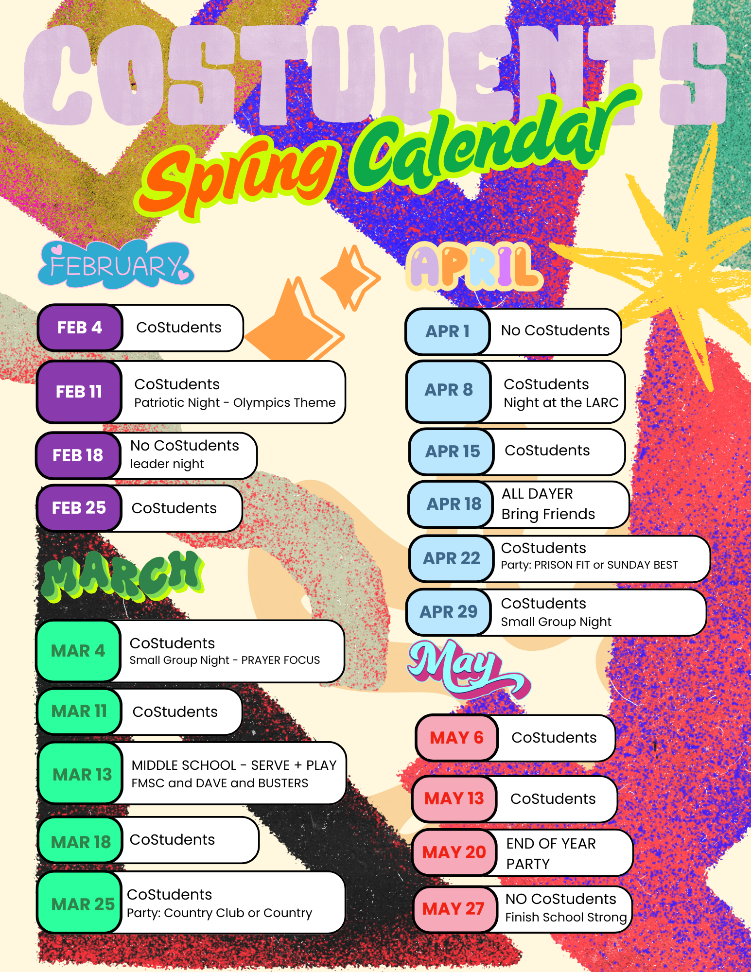 Most Wednesdays Middle School (grades 6-8) meets from 6-7:30pm and High School (grades 9-12) from 7:30-9pm. If you have any questions, we’d love to connect with you! CONTACT US HERE.